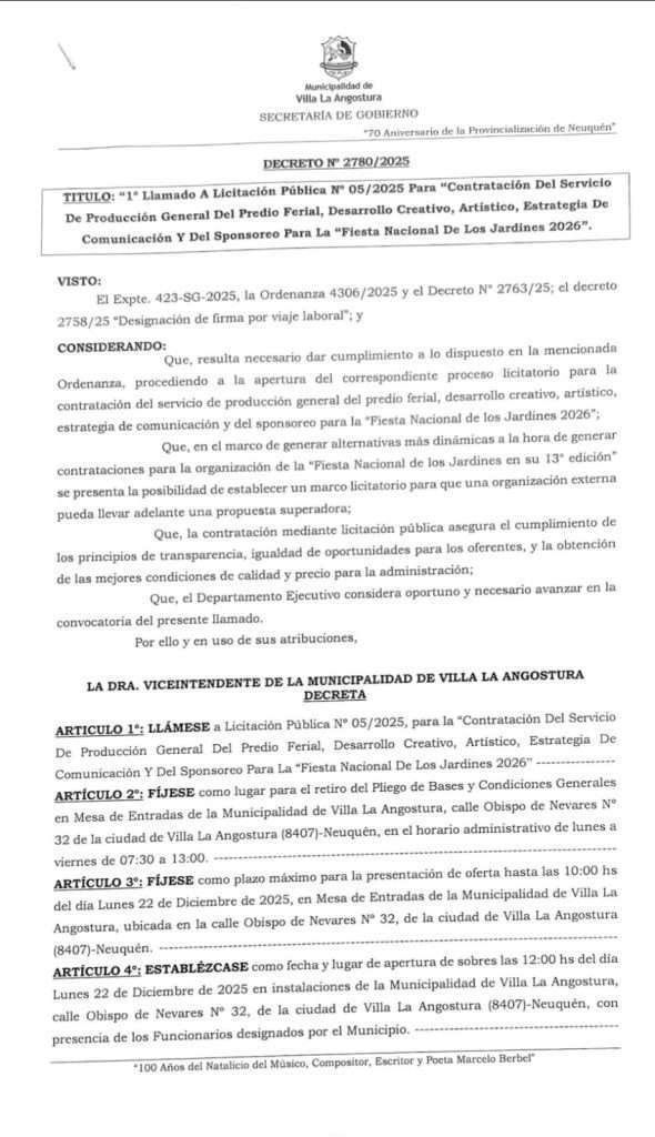de Nevares No 32 (8407); Villa La Angostura-Neuquén; en el Horario administrativo de 8:00 a 13:00