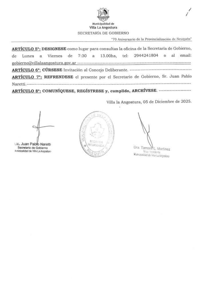 CONSULTAS: Secretaría de Gobierno, de la Municipalidad de Villa La Angostura, ubicada en Obispo