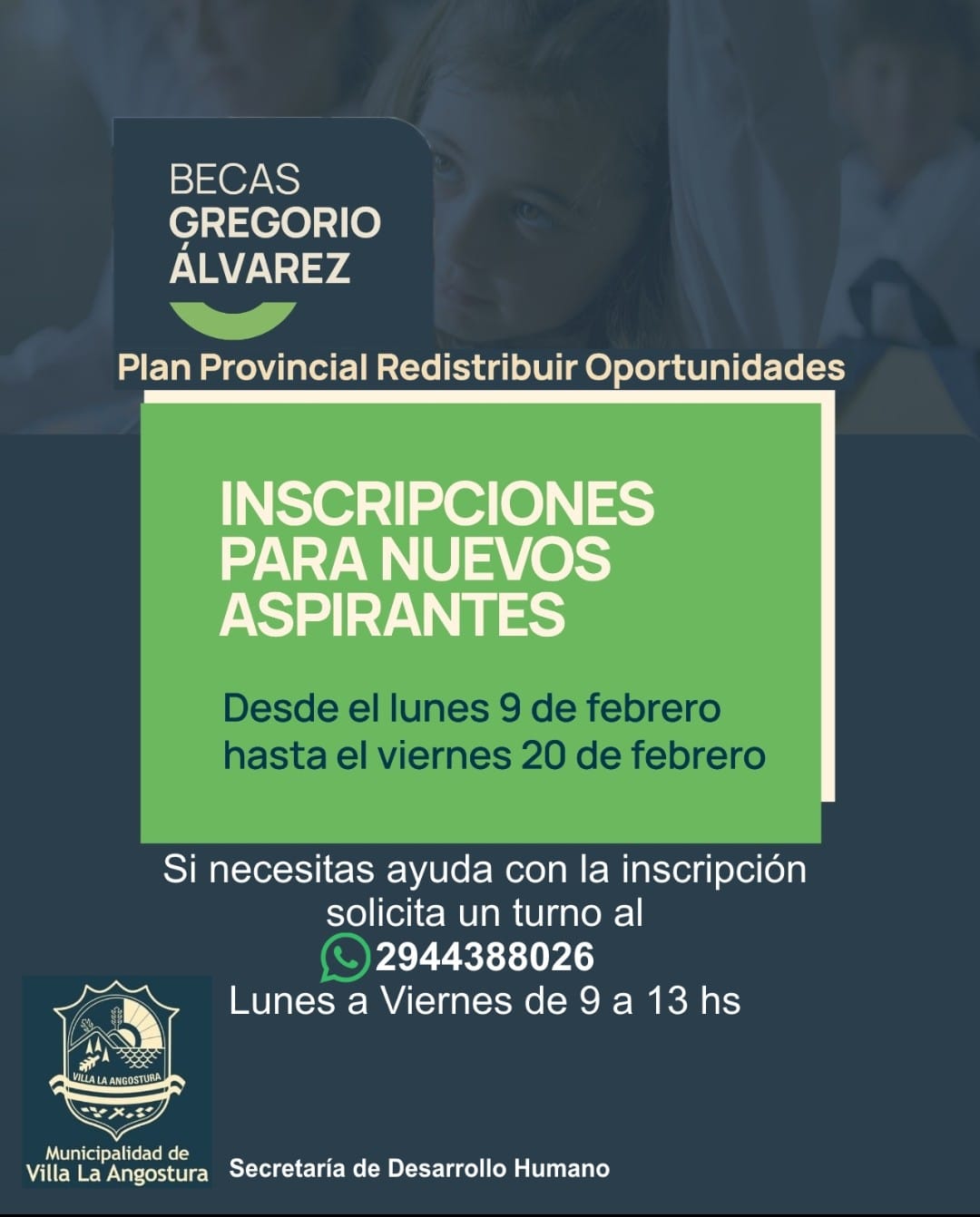 La Municipalidad de Villa La Angostura, a través de la Secretaría de Desarrollo Humano, informa que se encuentran abiertas las inscripciones para nuevos aspirantes al programa Becas Gregorio Álvarez, en el marco del Plan Provincial Redistribuir Oportunidades.