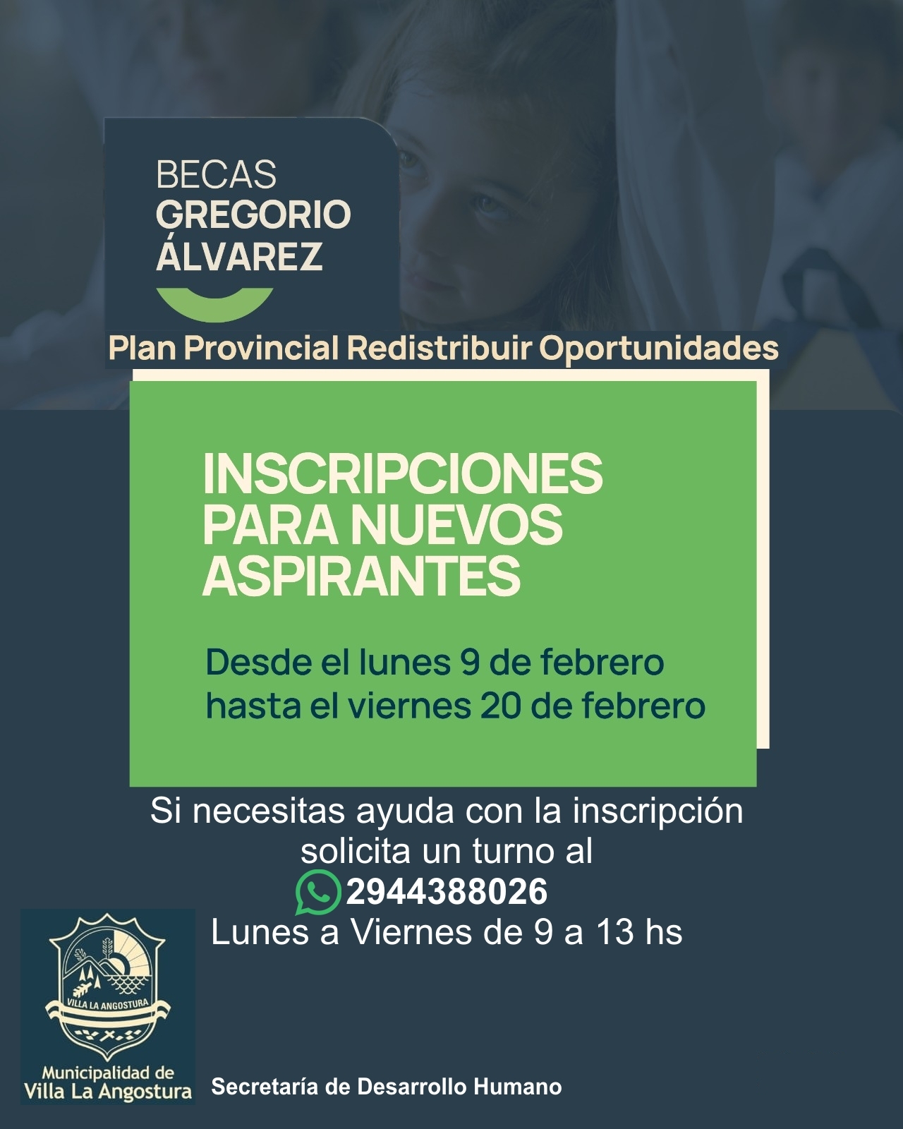 La Municipalidad de Villa La Angostura, a través de la Secretaría de Desarrollo Humano, informa que se encuentran abiertas las inscripciones para nuevos aspirantes al programa Becas Gregorio Álvarez, en el marco del Plan Provincial Redistribuir Oportunidades.