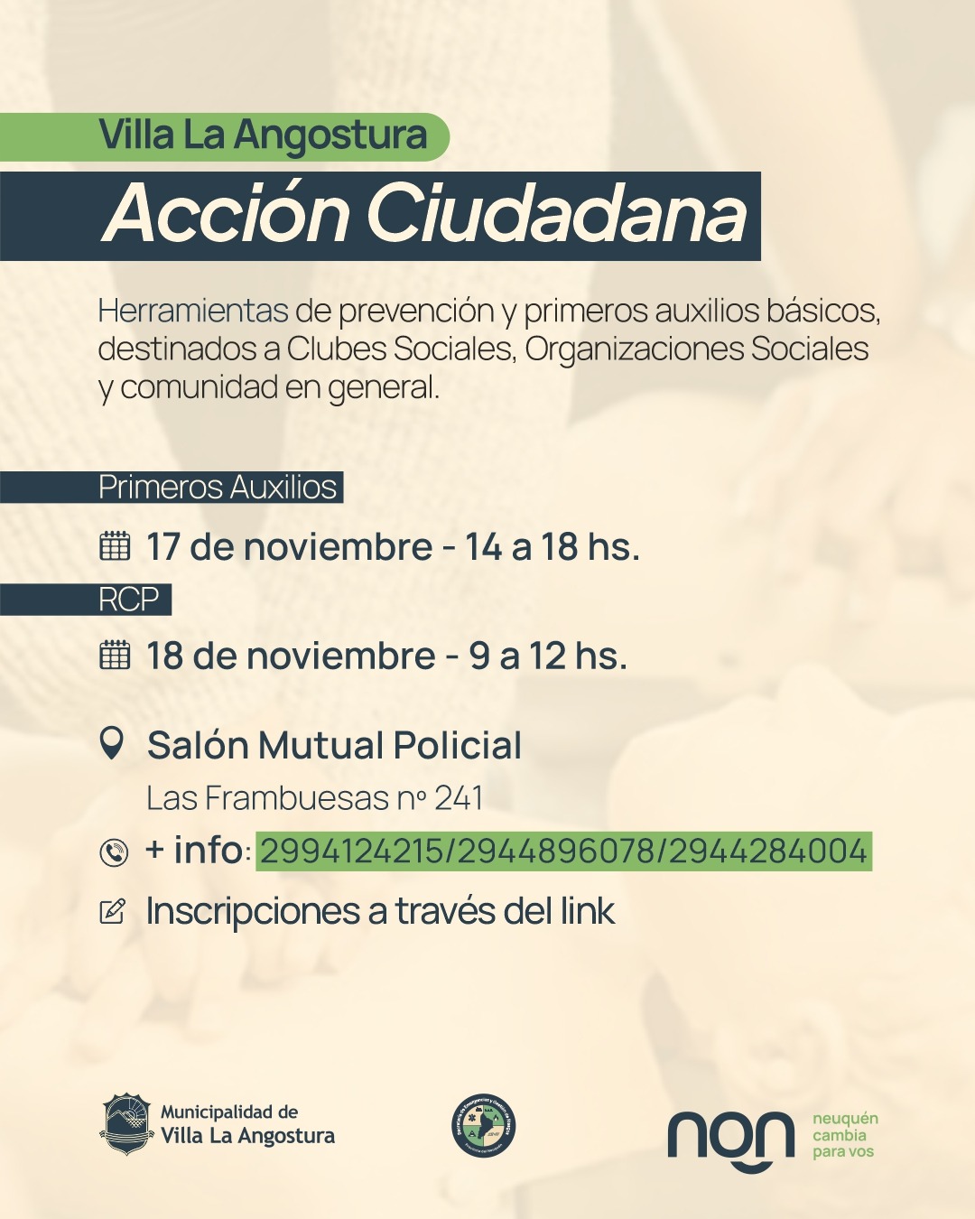 La Municipalidad de Villa La Angostura invita a participar de las jornadas “Acción Ciudadana”, una propuesta abierta a la comunidad que brindará herramientas de prevención y primeros auxilios básicos, destinadas a clubes sociales, organizaciones y vecinos en general.