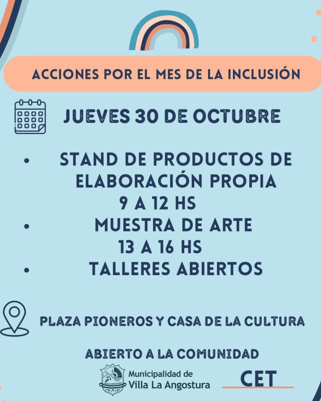 En el marco del Mes de la Inclusión, la Municipalidad de Villa La Angostura invita a la comunidad a participar de diversas actividades abiertas y gratuitas que se desarrollarán el jueves 30 de octubre en la Plaza de los Pioneros y la Casa de la Cultura, con el objetivo de promover la participación, la creatividad y el encuentro entre vecinos y vecinas.