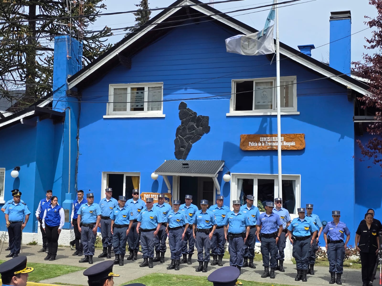 Esta mañana se llevó a cabo el acto en conmemoración del 122° Aniversario de la Comisaría N°28 de Villa La Angostura, en la Avenida Arrayanes, frente a la histórica dependencia policial.
