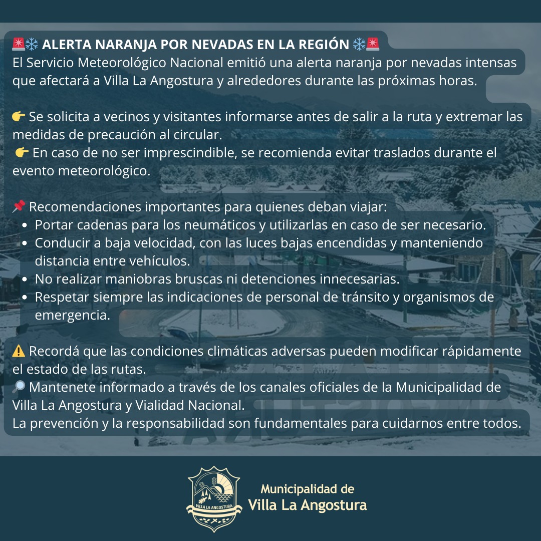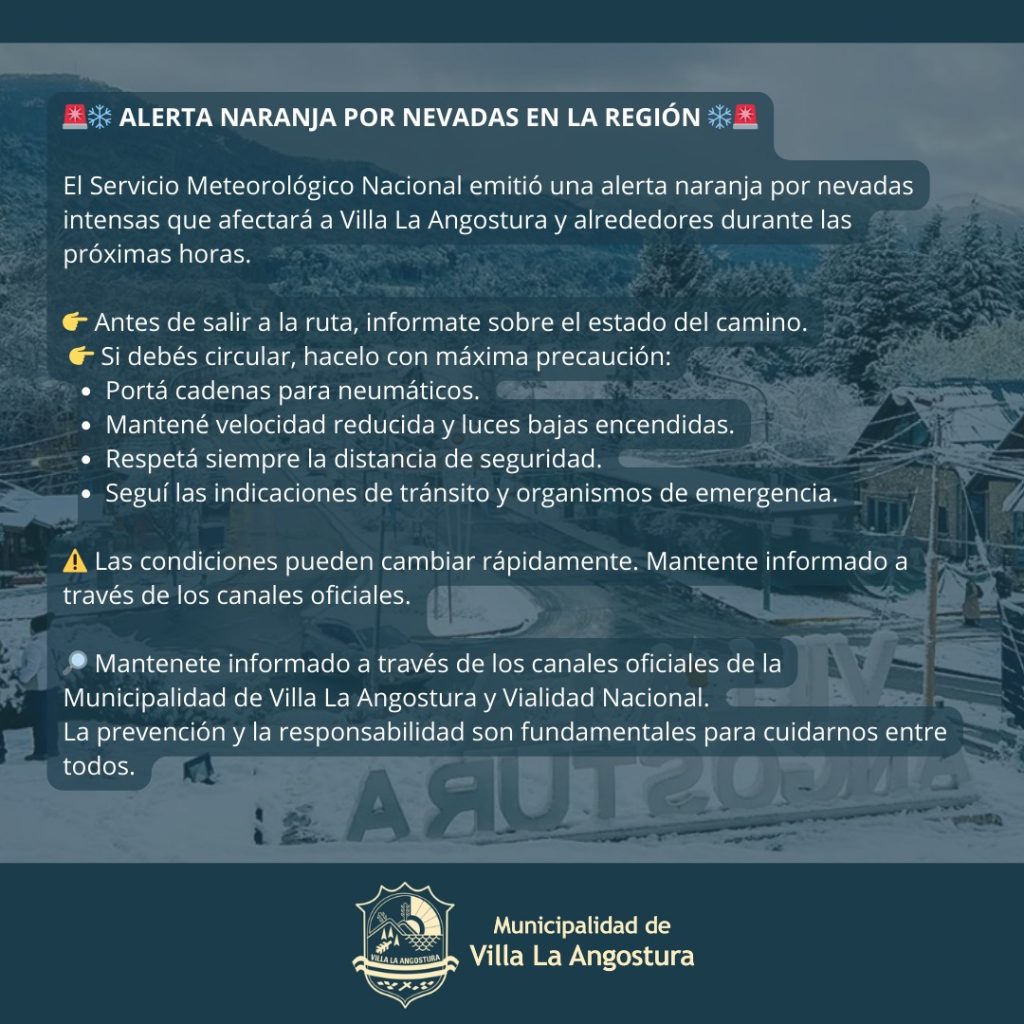El Servicio Meteorológico Nacional emitió una alerta naranja por nevadas intensas que afectará a Villa La Angostura y alrededores durante las próximas horas.