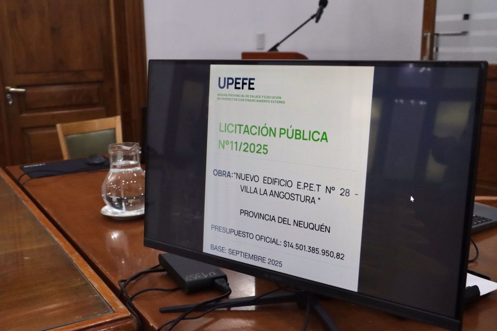 En un acto encabezado por el gobernador Rolando Figueroa junto a el Intendente de Villa La Angostura Javier Murer, funcionarios del Gabinete Municipal, Ministros y Diputados, abrieron este jueves los sobres de licitación para la construcción del nuevo edificio de la EPET N° 28 de Villa La Angostura, que contará con una superficie de 4.471 metros cuadrados y demandará una inversión de $14.501.385.950,82. En el proceso licitatorio inciado el 5 de diciembre de 2025, los 4 oferentes presentaron la documentación para construir el edificio en un plazo que está previsto sea de 660 días corridos.