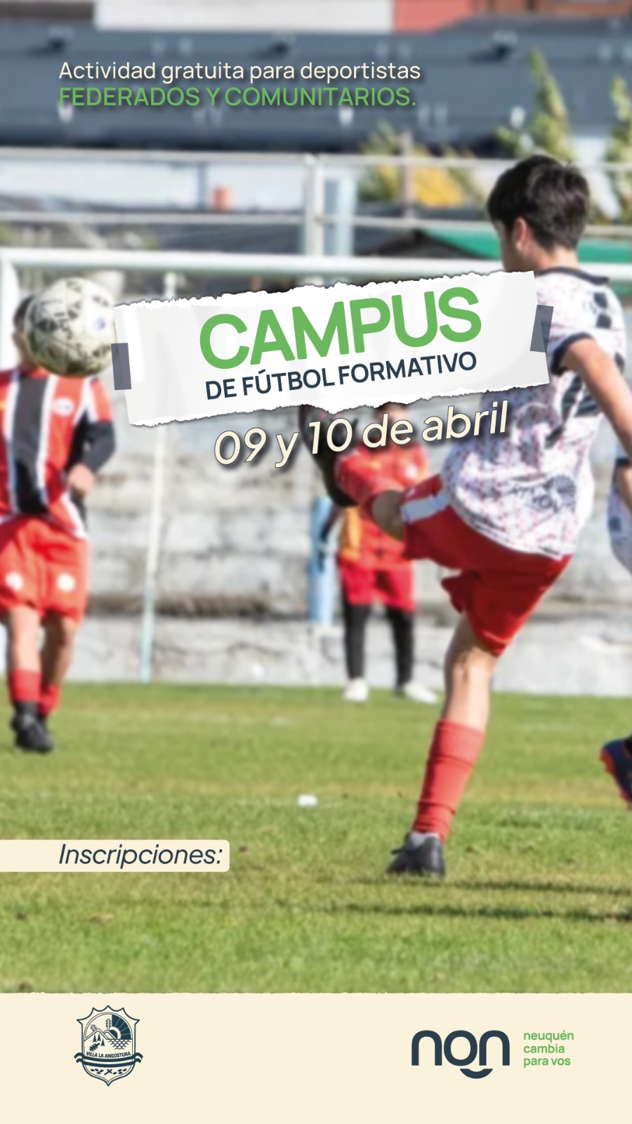 Lugar: Cancha Municipal de Villa la AngosturaFecha : 10 de abrilActividad GratuitaAsistir con ropa deportiva, canilleras, medias largas, botines y/o zapatillas de fútbol estilo papi.