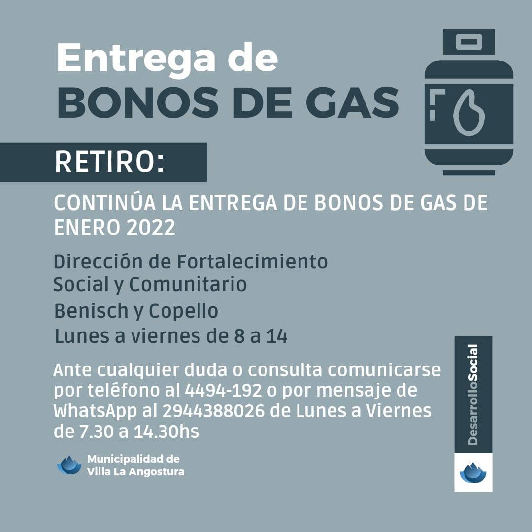 La Secretaría de Desarrollo Social informa que continúa con la entrega de bonos de gas correspondiente a enero. Los mismos deberán retirarse en la Dirección de Fortalecimiento Social y Comunitario ubicada en Benisch y Copello, de lunes a viernes de 8:00 a 14:00 horas.