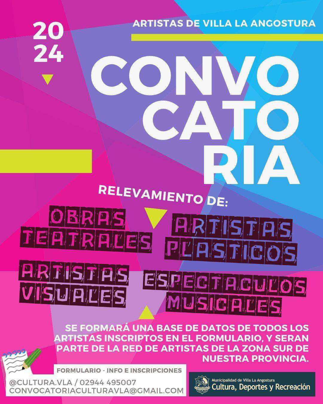 La Secretaría de Cultura, Deportes, Recreación y Juventudes de la Municipalidad de Villa La Angostura invita a todos los artistas locales a inscribirse en un relevamiento que permitirá la creación de una base de datos de artistas angosturenses. Esta convocatoria está dirigida a artistas plásticos, creadores de obras teatrales, artistas visuales, y aquellos involucrados en espectáculos y proyectos musicales de la localidad.