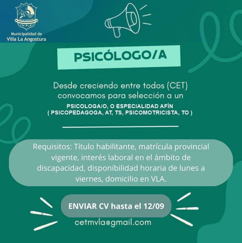 Desde el CET “Creciendo entre todos) de la Municipalidad de Villa La Angostura, se convoca a un profesional en Psicología o o especialidad afín para unirse a su equipo.