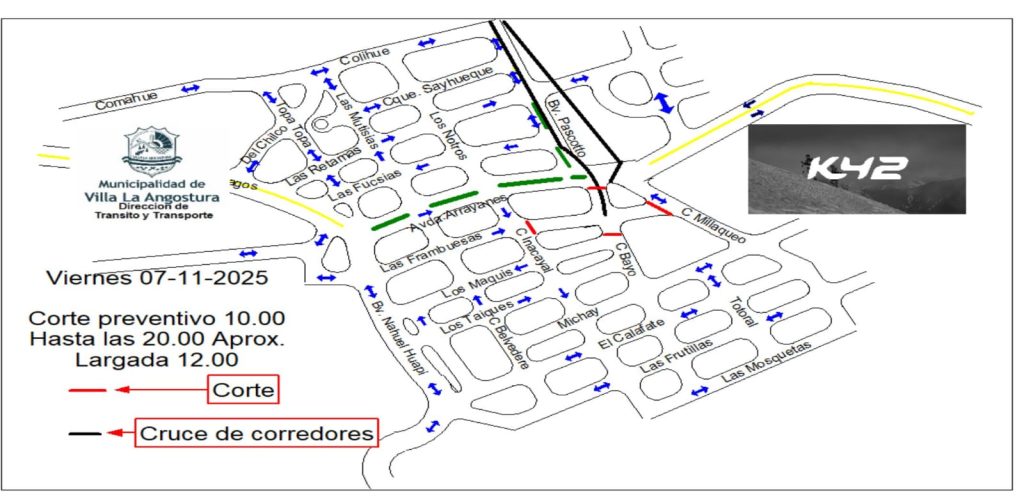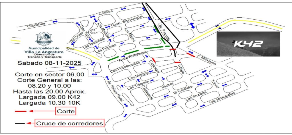 La Municipalidad de Villa La Angostura a través de la Dirección de Transito y Transporte informa a la comunidad que, con motivo de la realización de la Carrera K42, se llevarán a cabo restricciones al tránsito y transito asistido en distintos sectores de la localidad durante los próximos días.