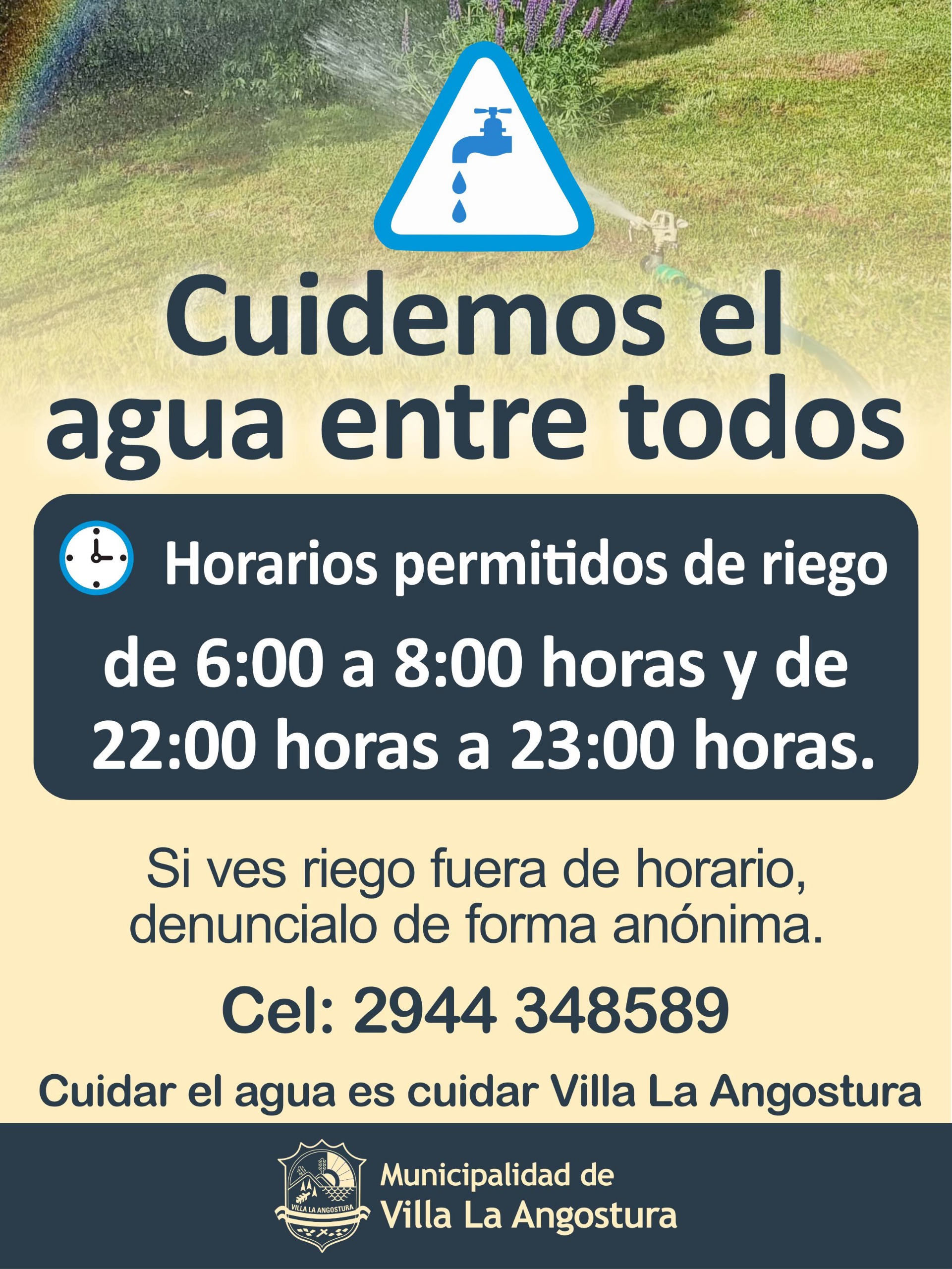 La Municipalidad de Villa La Angostura recuerda a la comunidad que los horarios permitidos de riego son de 6:00 a 8:00 h y de 22:00 a 23:00 h.