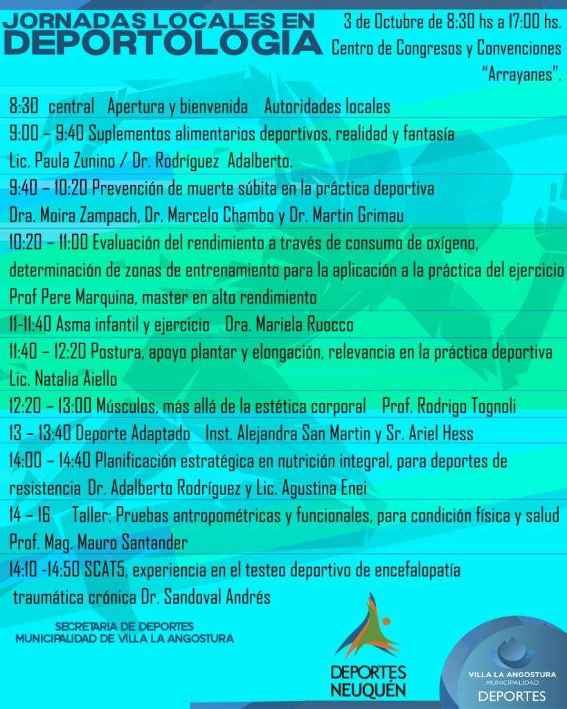 La Secretaría de Deportes, con el apoyo del Ministerio de Deportes de la Provincia del Neuquén, invita a participar de las Jornadas locales de Deportología, el día 3 de octubre de 8:30 a 17 horas en el Centro de Congresos y Convenciones Arrayanes.