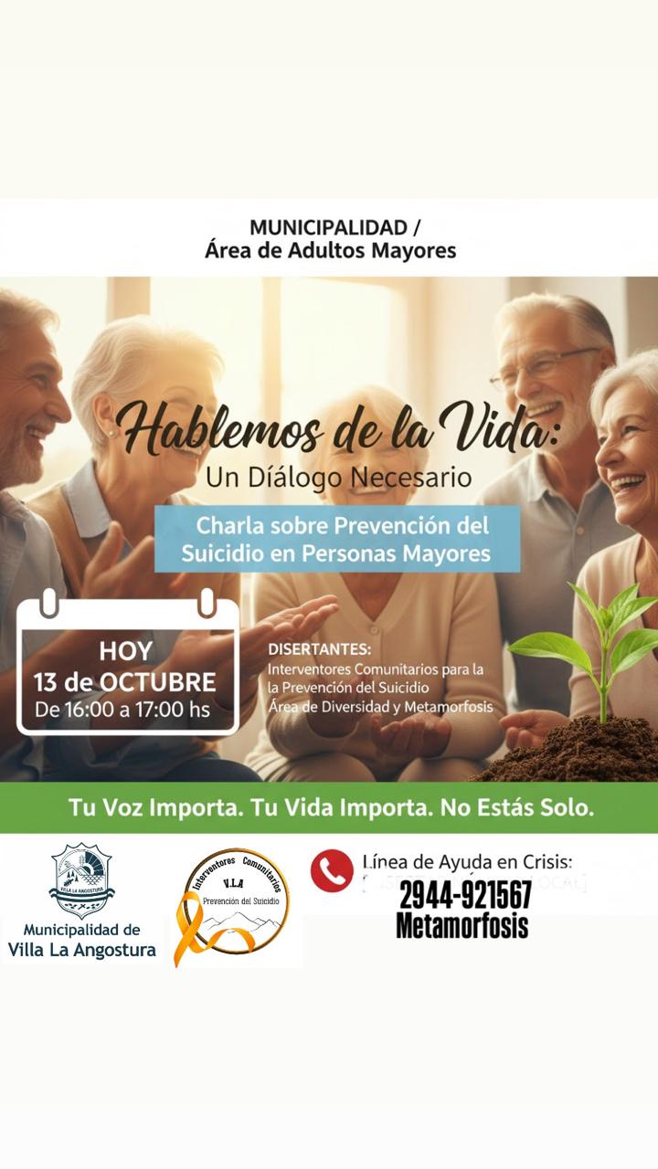 Este lunes 13 de octubre, el Área de Adultos Mayores de la Municipalidad de Villa La Angostura llevara adelante la charla “Hablemos de la Vida: Un Diálogo Necesario”,en el Centro de Cuidados Infantiles (CCI) en el horarios de 16 a 17 horas, un encuentro destinado a promover la prevención del suicidio en personas mayores y generar un espacio de escucha, acompañamiento y reflexión.