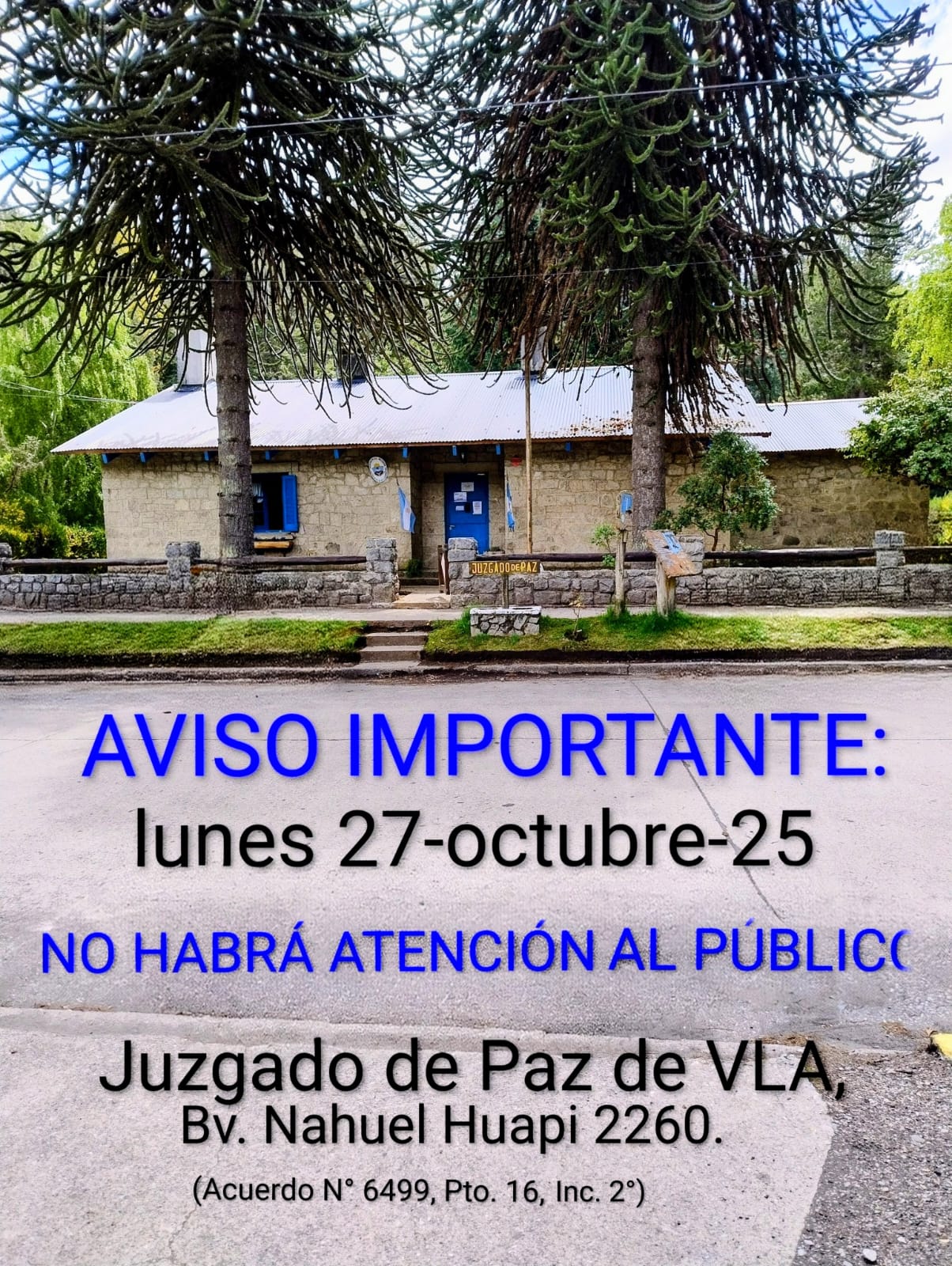 Se informa a la comunidad que el lunes 27 de Octubre de 2025 el Juzgado de Paz de Villa La Angostura permanecerá sin atención al público, en cumplimiento de lo establecido por el Acuerdo N° 6499, Pto. 16, Inc. 2°.