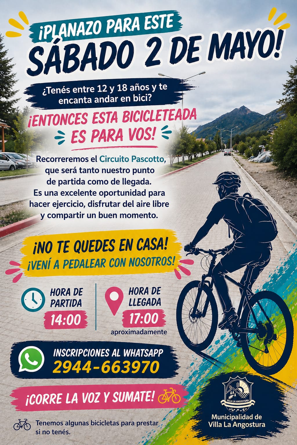 La Municipalidad de Villa La Angostura, a través de la Subsecretaria de Deportes y la Secretaria de Desarrollo Humano – DINAF, invitan a todos los jóvenes de entre 12 y 18 años a sumarse a la gran bicicleteada que se realizará este sábado 2 de mayo por el Circuito Pascotto.