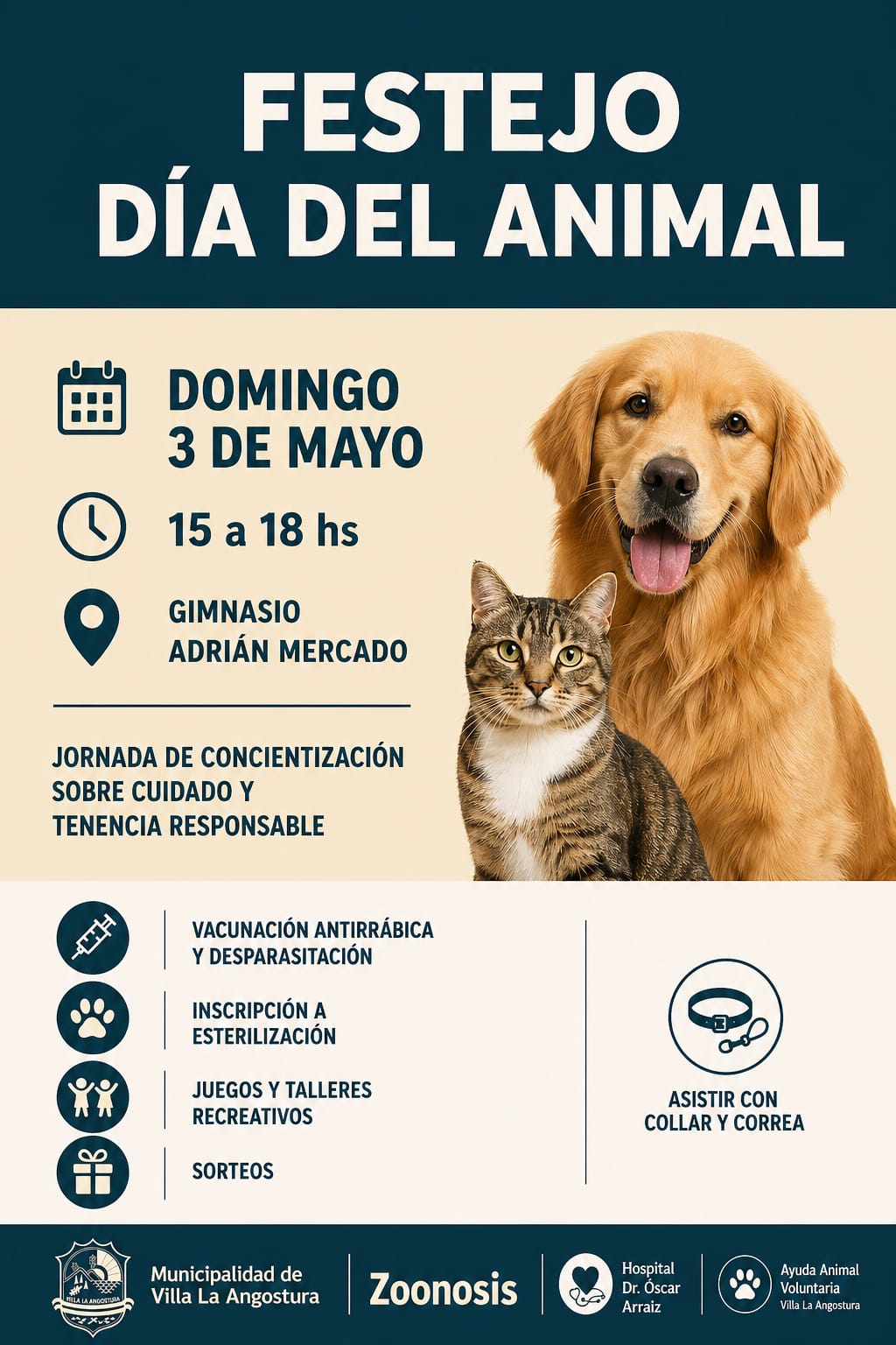 El evento se llevará a cabo el domingo 3 de mayo, de 15 a 18 horas, en el Gimnasio Adrián Mercado. Durante la jornada se ofrecerán distintas actividades y servicios gratuitos para vecinos y sus mascotas, entre ellos: