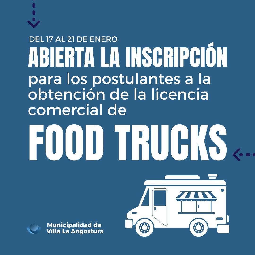 La Dirección de Comercio, dependiente de la Secretaria de Economía, informa a los vecinos de la localidad que entre el 17 y el 21 de enero de 2022 se encontrará abierta la inscripción para los postulantes a la obtención de la licencia comercial de Food Trucks.