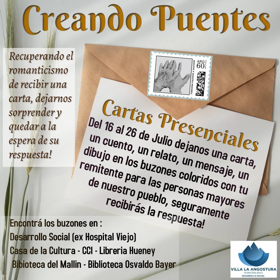 Desde el Área de Adultos Mayores dependiente de la Secretaría de Desarrollo Social, informan que prorrogaron hasta el 1ro de agosto la posibilidad de participar enviando cartas de puño y letra destinadas a adultos mayores, y en caso de quererlo agregar el remitente para recibir la respuesta. Este programa se enmarca en lograr recuperar el romanticismo de recibir una carta, sorprendernos y esperar la respuesta. Los integrantes del Área nos contaron que hasta la fecha de cierre están disponibles en la oficina del área en la secretaría de Desarrollo Social (edificio del viejo Hospital), Centro de Cuidados Infantiles CCI, Librería Hueney y las Bibliotecas Del Mallin y Osvaldo Bayer.