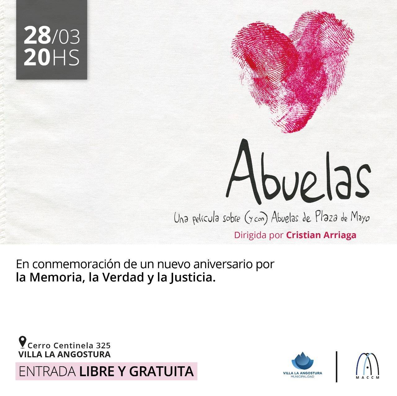 El Museo de Arte Contemporáneo Conrad Meier (MAC), dependiente de la Subsecretaría de Cultura, recuerda a la población que hoy lunes 28 de marzo a las 20 horas en sus instalaciones ubicadas en Cerro Centinela 325 se proyectará la película “ABUELAS”, una película sobre, y con, Abuelas de Plaza de Mayo.