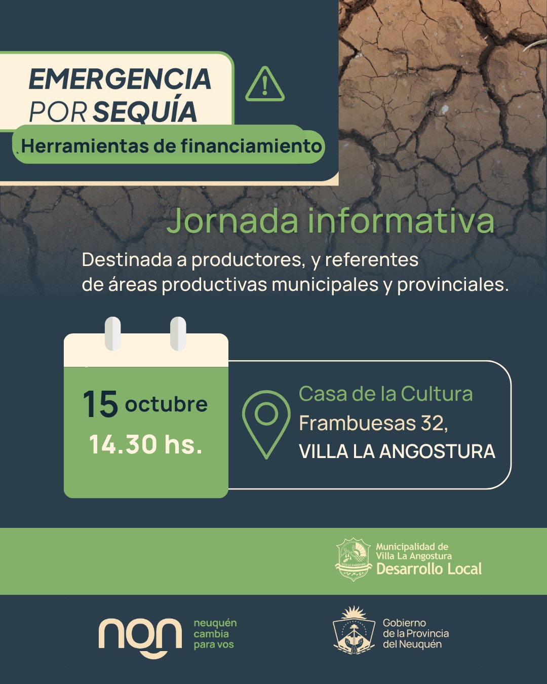 La Municipalidad de Villa La Angostura, a través del área de Desarrollo Local, invita a productores y referentes de áreas productivas municipales y provinciales a participar de una jornada informativa sobre herramientas de financiamiento en el marco de la emergencia por sequía.