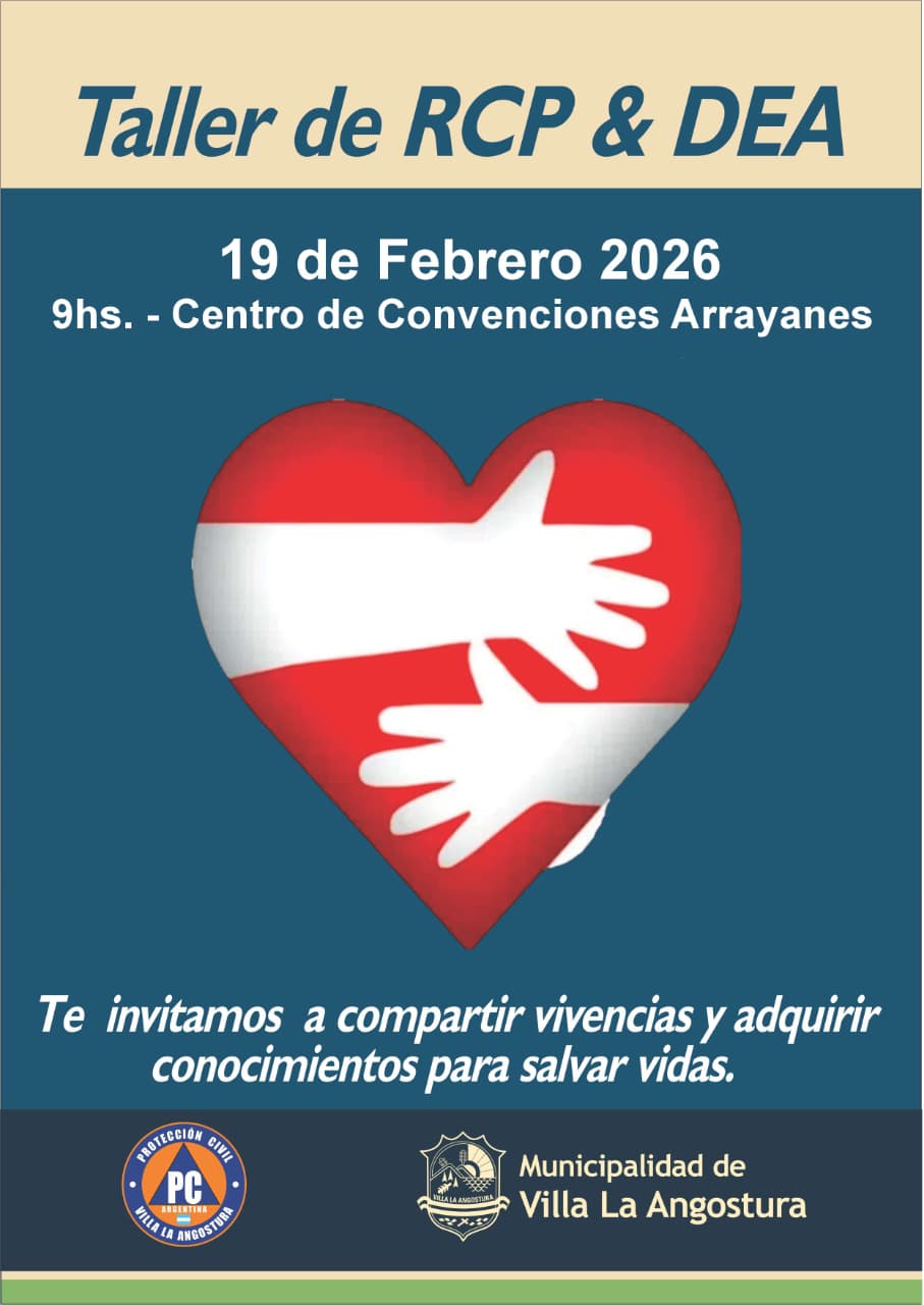 La Municipalidad de Villa La Angostura, a través de Protección Civil, invita a la comunidad a participar del Taller de RCP y uso de DEA, que se realizará el 19 de febrero de 2026, a las 9:00 hs, en el Centro de Convenciones Arrayanes.