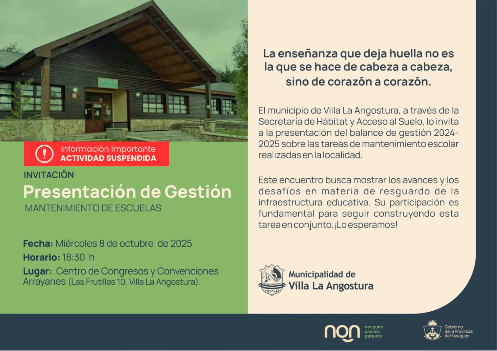 La Municipalidad de Villa La Angostura informa que la Presentación de Gestión – Mantenimiento de Escuelas, programada para el miércoles 8 de octubre a las 18:30 h en el Centro de Congresos y Convenciones Arrayanes, queda suspendida.