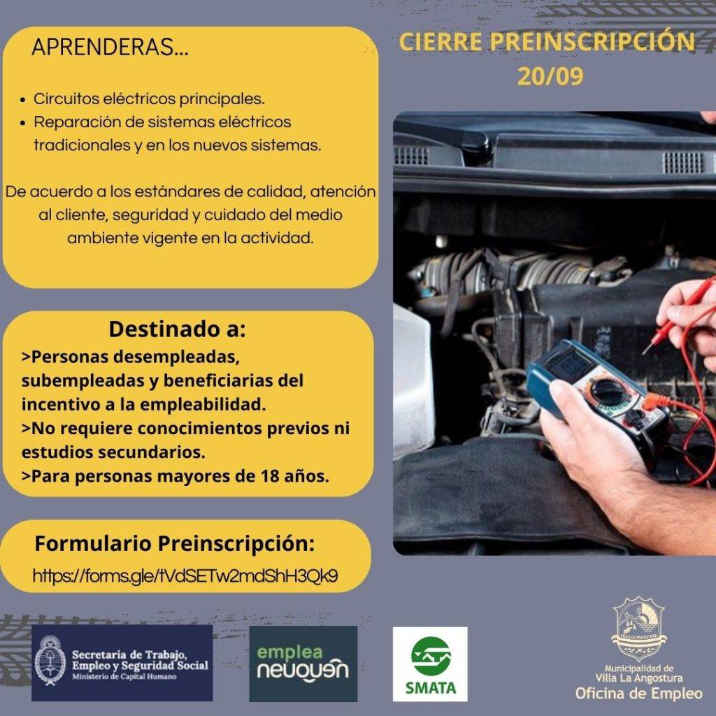 La Secretaria de Gobierno de la Municipalidad de Villa la Angostura, a través de la Oficina de Empleo y en forma conjunta con la secretaria de Trabajo, Empleo y Seguridad Social de la Nación dependiente del Ministerio de Capital Humano y SMATA anuncian el inicio del Curso de ELECTRICIDAD DEL AUTOMOTOR- NIVEL INICIAL, con modalidad teórica- practica.