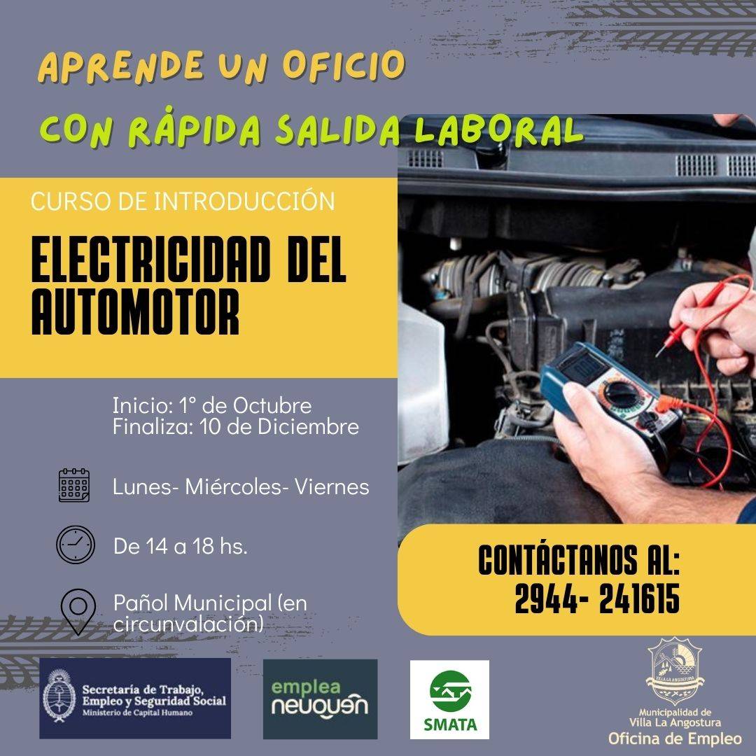La Secretaria de Gobierno de la Municipalidad de Villa la Angostura, a través de la Oficina de Empleo y en forma conjunta con la secretaria de Trabajo, Empleo y Seguridad Social de la Nación dependiente del Ministerio de Capital Humano y SMATA anuncian el inicio del Curso de ELECTRICIDAD DEL AUTOMOTOR- NIVEL INICIAL, con modalidad teórica- practica.