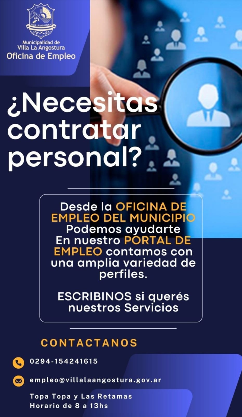 La Municipalidad de Villa La Angostura, a través de la Oficina de Empleo, invita a empleadores y emprendedores locales a utilizar sus servicios gratuitos de intermediación laboral para la búsqueda de personal.