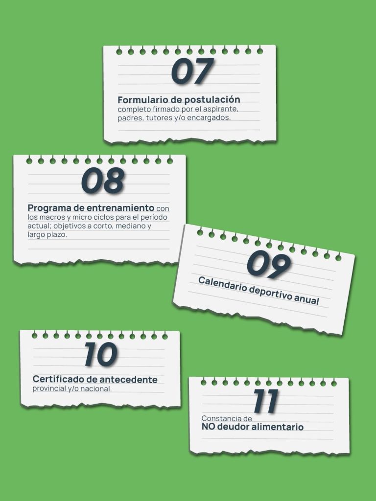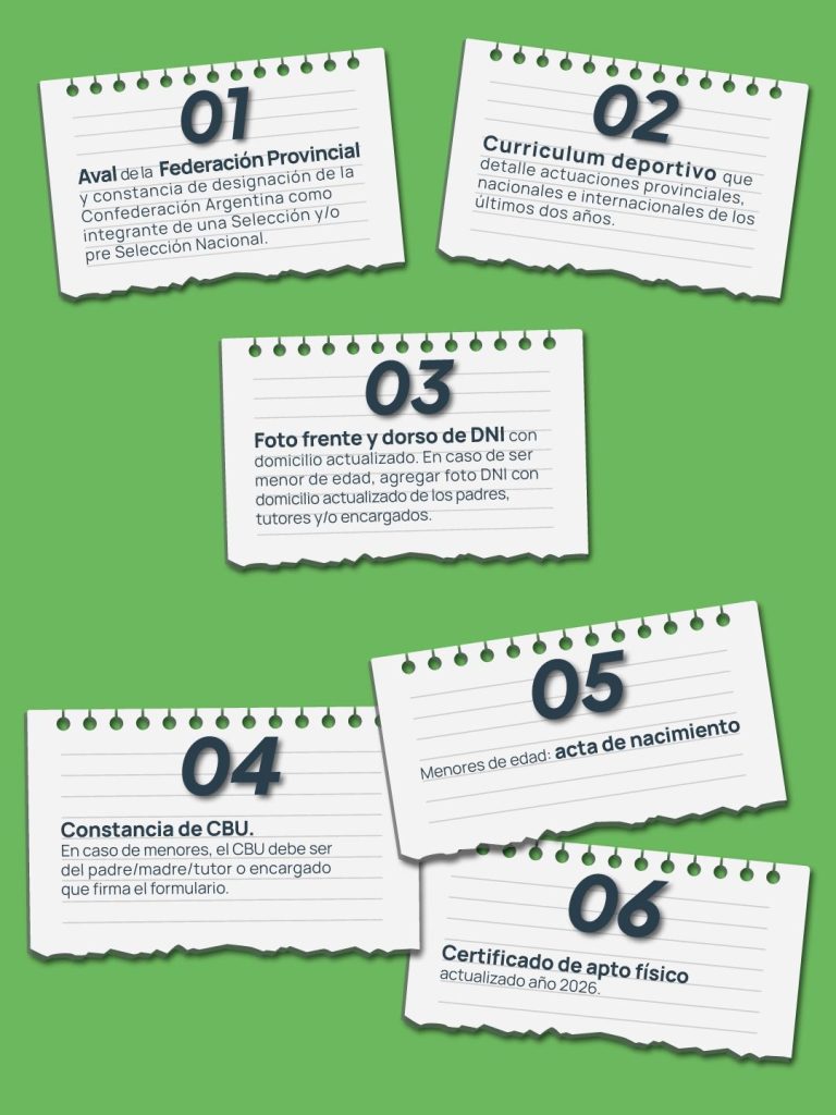 Entre los requerimientos también se deberán presentar constancia del CBU del atleta o de los padres -si el atleta es menor-; acta de nacimiento (para menores de edad); certificado de apto físico actualizado; programa de entrenamiento con los respectivos micro y macro ciclos de entrenamiento en el periodo actual; calendario deportivo anual, como también, los objetivos a corto, mediano y largo plazo.