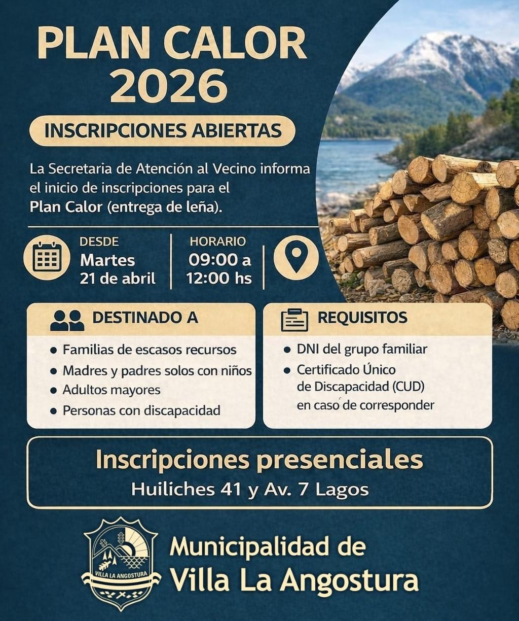 Desde la Secretaria de Atención al Vecino, se informa a la comunidad que desde el dia Martes 21 de abril, a partir de las 09:00 hs y hasta las 12:00 hs,se comenzará con la inscripción para el Plan Calor 2026. (Entrega de leña), las inscripciones se realizarán en la Secretaria de Atencion al Vecino, ubicada en calle Huiliches 41 y Av. 7 Lagos.