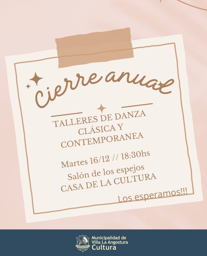 La Secretaría de Cultura, invita a la comunidad a participar del Cierre Anual de los Talleres de Danza Clásica y Contemporánea, que se realizará hoy martes 16 de diciembre a las 18:30 hs, en el Salón de los Espejos de la Casa de la Cultura.