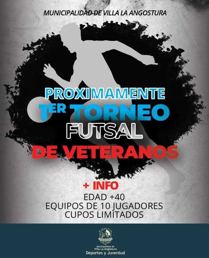 La Municipalidad de Villa La Angostura, a través de la Secretaría de Deportes y Juventud, presenta el 1° Torneo de Futsal de Veteranos, destinado a jugadores mayores de 40 años.