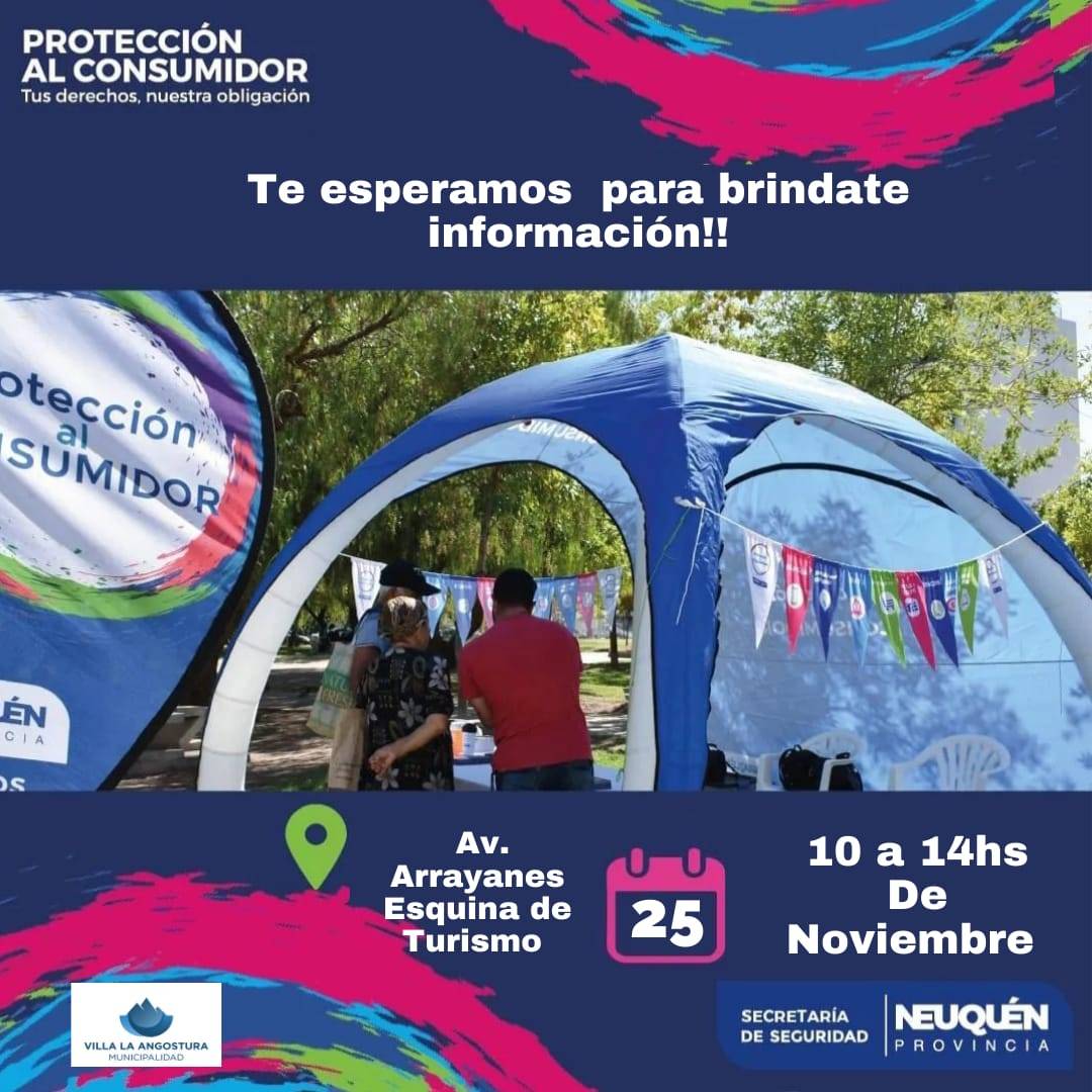 El Área de Protección al Consumidor, dependiente de la Secretaría de Gobierno, con el acompañamiento de la Secretaría de Seguridad de la Provincia de Neuquén,  invitan a la comunidad de Villa La Angostura a acercarse el viernes 25 de noviembre de 10 a 14 horas a la esquina frente a la Oficina de Turismo (Av. Arrayanes 9), donde se montará un stand informativo para todos aquellos que deseen recibir asesoramiento sobre sus derechos y obligaciones como consumidores y usuarios.