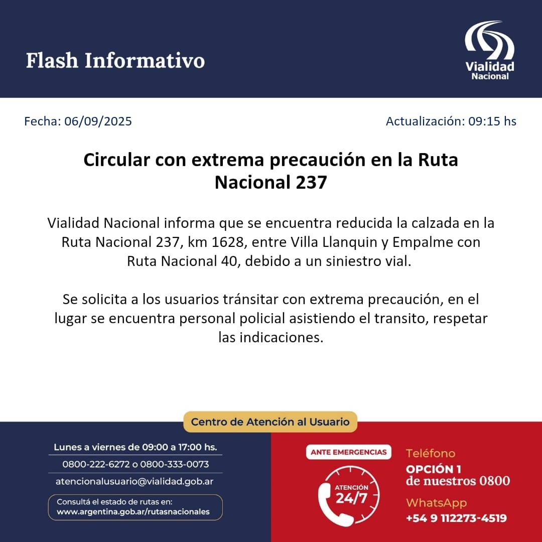 La Municipalidad de Villa La Angostura informa a la comunidad que, según lo comunicado por Vialidad Nacional, la calzada de la Ruta Nacional 237 se encuentra reducida a la altura del km 1628, entre Villa Llanquín y el empalme con Ruta Nacional 40, debido a un siniestro vial.