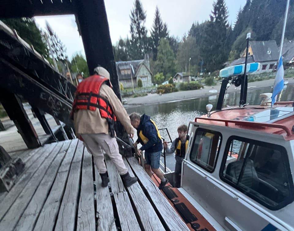 Efectivos de la Prefectura Naval Argentina asistieron a dos hombres que no podían regresar a la costa debido al aumento repentino del viento y el oleaje en las aguas del lago Nahuel Huapi, en cercanías de la Bahía San Patricio, Península de Quetrihue.