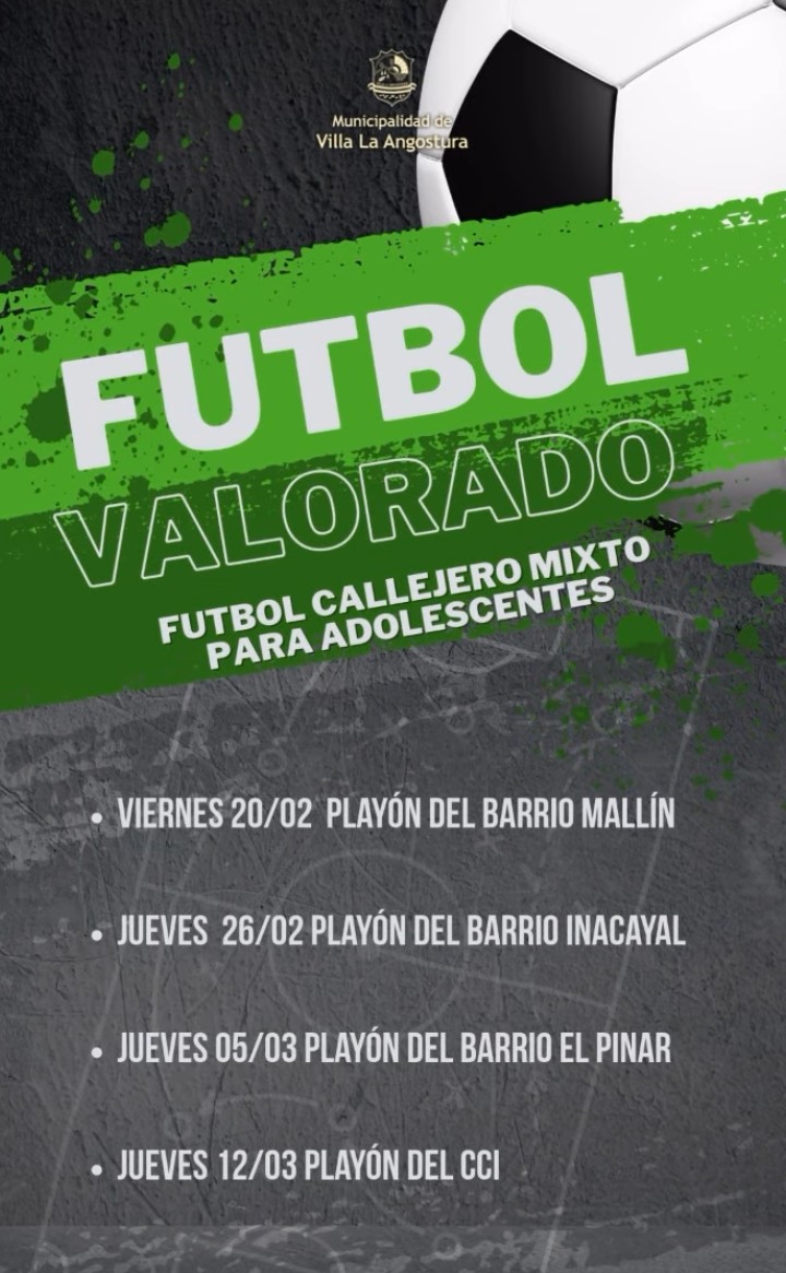 La Municipalidad de Villa La Angostura invita a adolescentes a participar de los próximos encuentros de Fútbol Valorado, la propuesta de fútbol callejero mixto que continúa recorriendo los playones de los barrios Mallín, Inacayal, El Pinar y CCI.