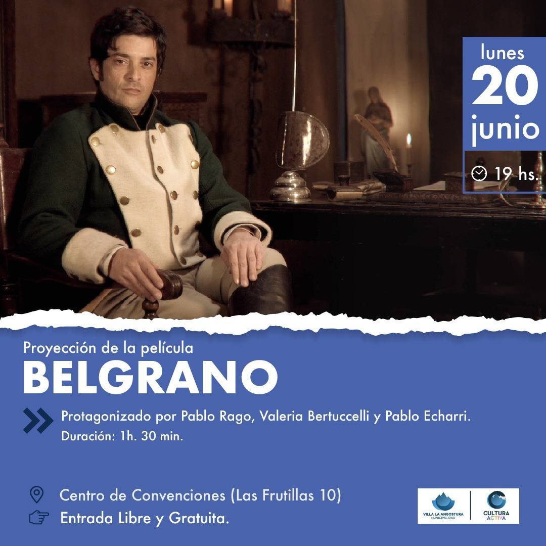 En el marco de la conmemoración del Día de la Bandera, la Subsecretaría de Cultura, dependiente de la Secretaría de Gobierno, invita a la comunidad a disfrutar de la proyección de la película Belgrano, que se proyectará en lunes 20 de junio a las 19 horas en el Centro de Congresos y Convenciones Arrayanes, ubicado en Las Frutillas 10.
