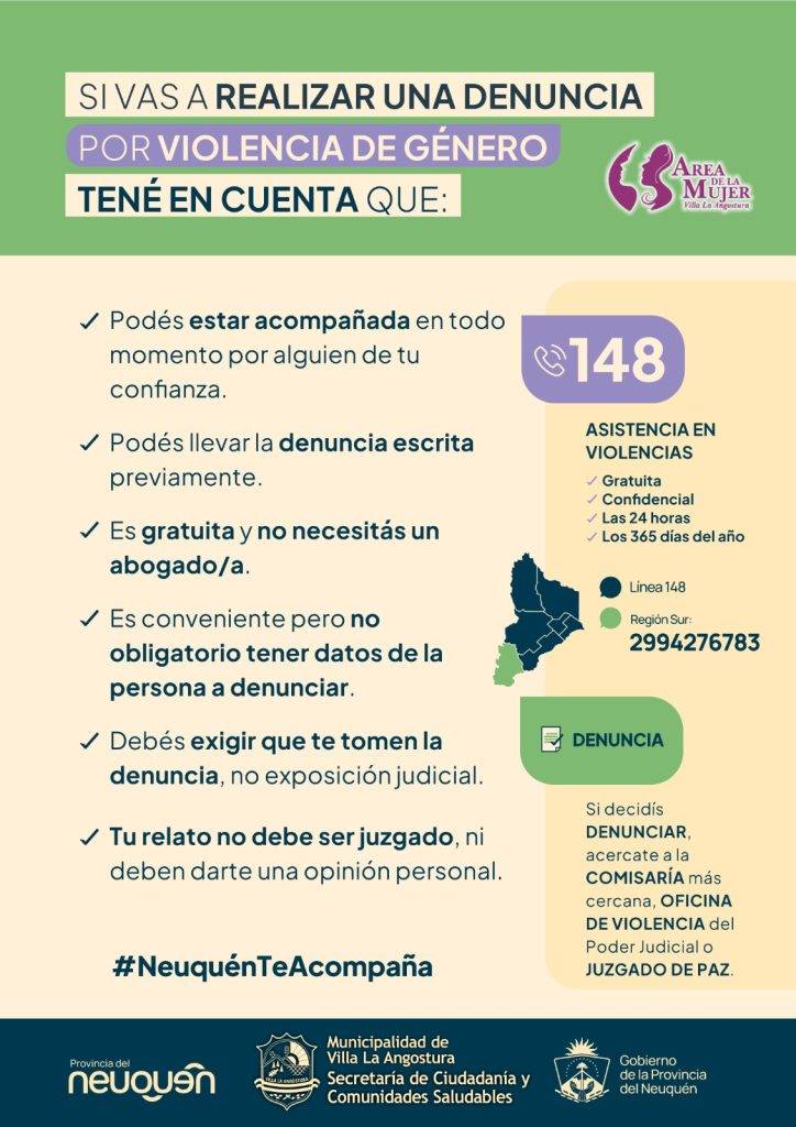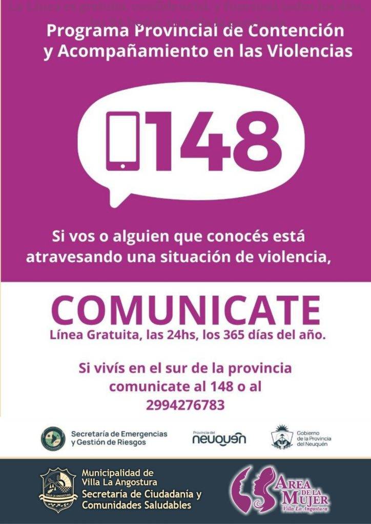 La Municipalidad de Villa La Angostura, a través del Área de la Mujer y la Secretaría de Ciudadanía y Comunidades Saludables, recuerda a la comunidad que existen líneas de atención y equipos de acompañamiento disponibles las 24 horas, los 365 días del año.