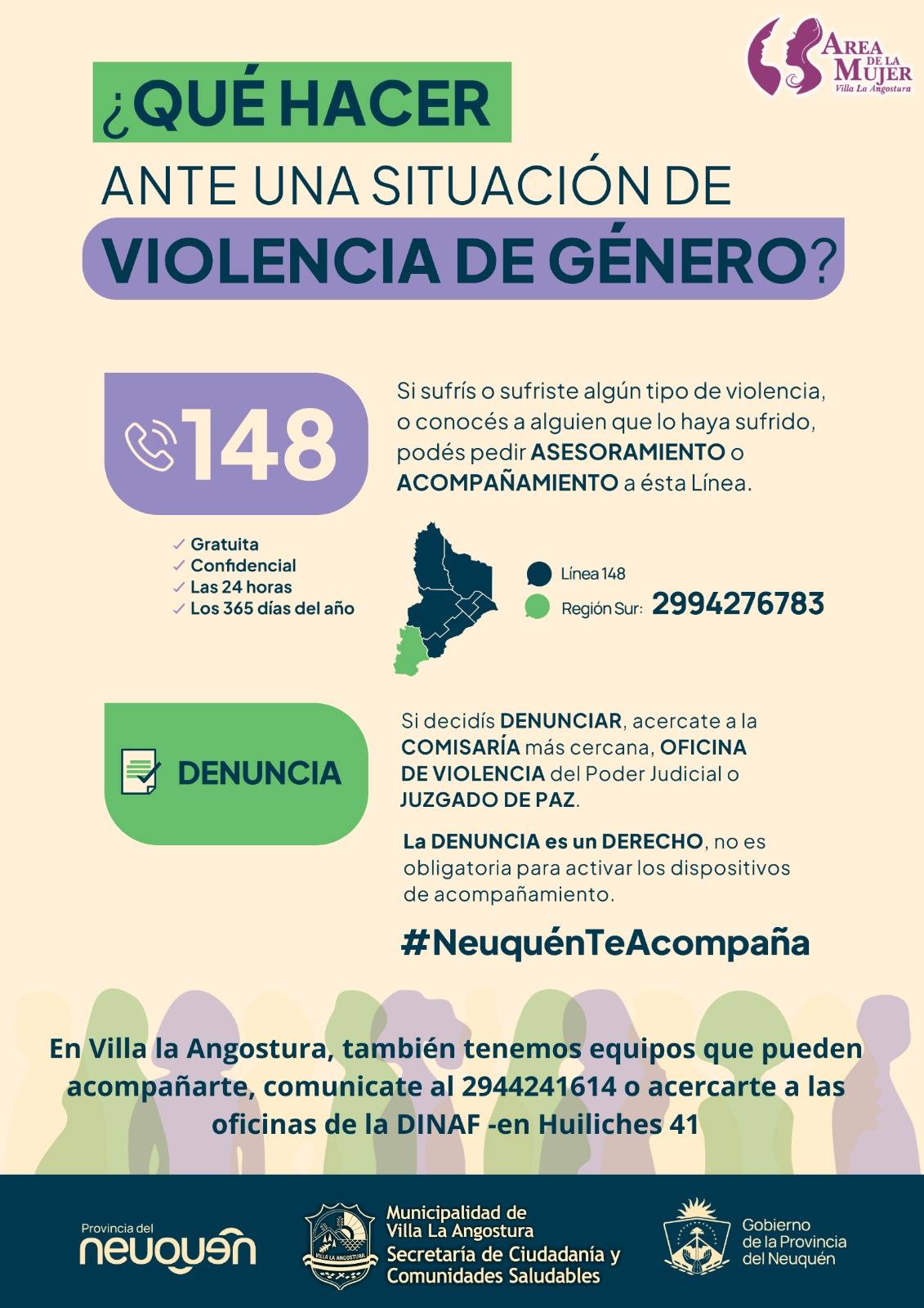La Municipalidad de Villa La Angostura, a través del Área de la Mujer y la Secretaría de Ciudadanía y Comunidades Saludables, recuerda a la comunidad que existen líneas de atención y equipos de acompañamiento disponibles las 24 horas, los 365 días del año.