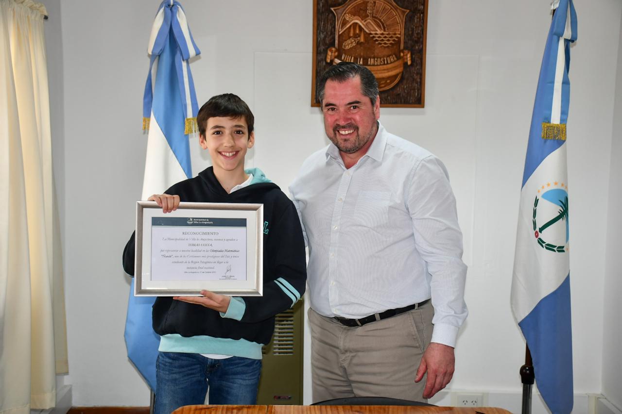 El intendente de Villa La Angostura, Javier Murer, junto al secretario de Gobierno, Lic. Juan Pablo Naretti, realizaron la entrega de un reconocimiento al estudiante Tomás Costa, quien representará a nuestra localidad en la instancia final nacional de las Olimpíadas Matemáticas “Ñandú”, uno de los certámenes académicos más prestigiosos del país.
