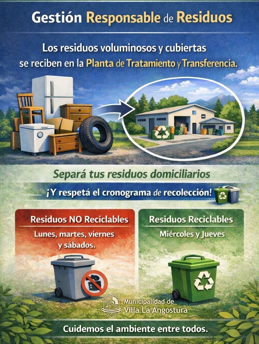 La Municipalidad de Villa La Angostura, a través de la Dirección de Residuos, recuerda que los residuos voluminosos (línea blanca, muebles, entre otros) y las cubiertas deben ser llevados a la Planta de Tratamiento y Transferencia para su correcta disposición final.