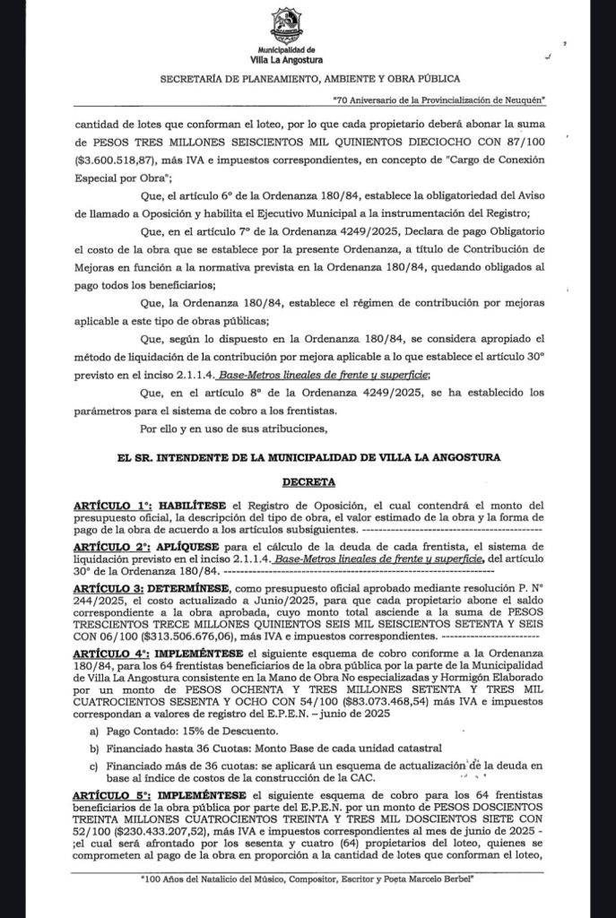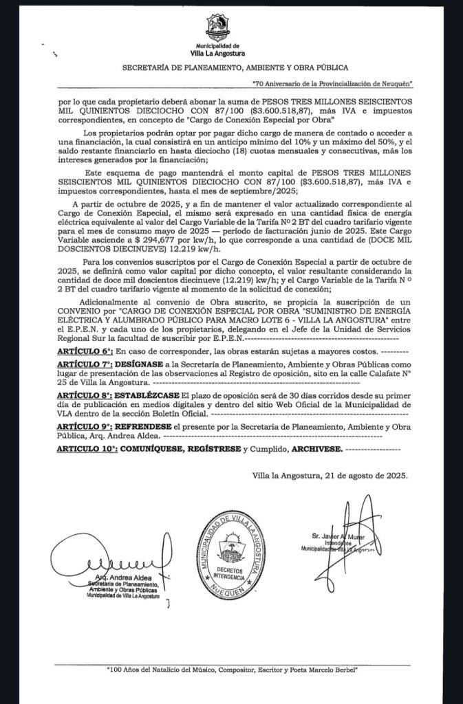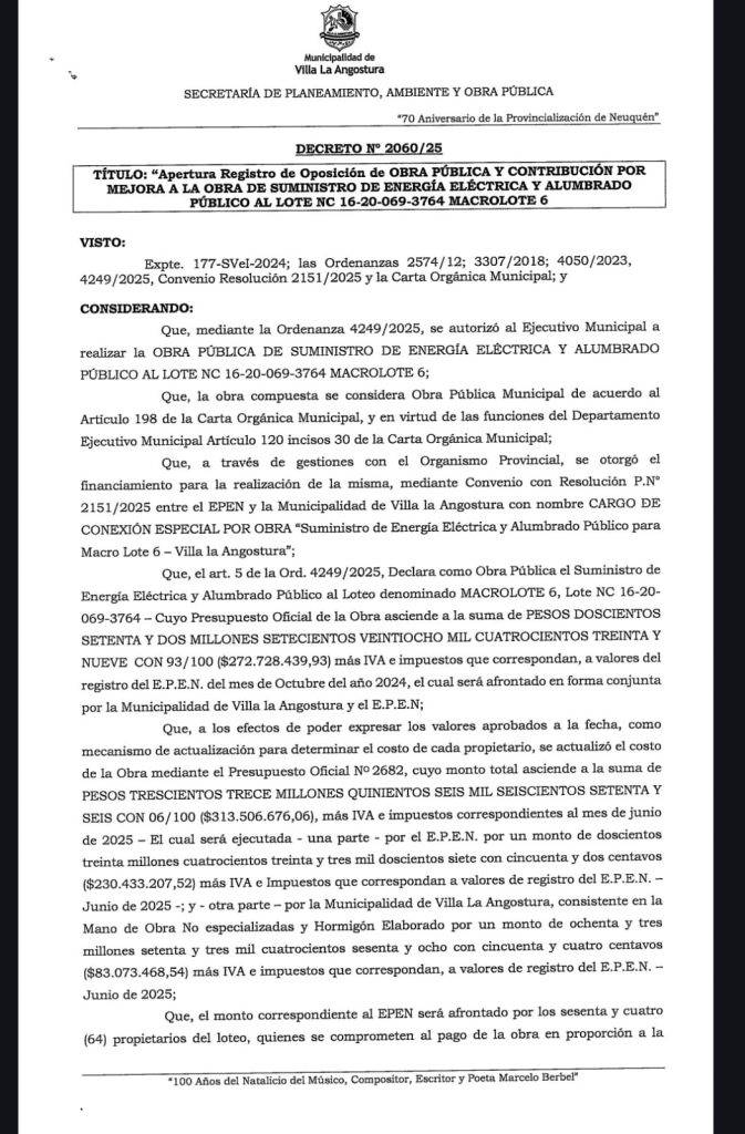 La Municipalidad de Villa La Angostura, informa a la comunidad que según establece el Decreto N° 2060/2025, se abre el registro de oposición para la obra pública y contribución por mejora a la Obra de Suministro de energía eléctrica y alumbrado público al lote NC 16-20-069-3764 Macrolote 6. Que a través de la Ordenanza N° 4249-2025, se declara como Obra Pública, el Suministro de Energía Eléctrica y Alumbrado Público al Lote NC 16-20-069-3764 Macrolote 6.