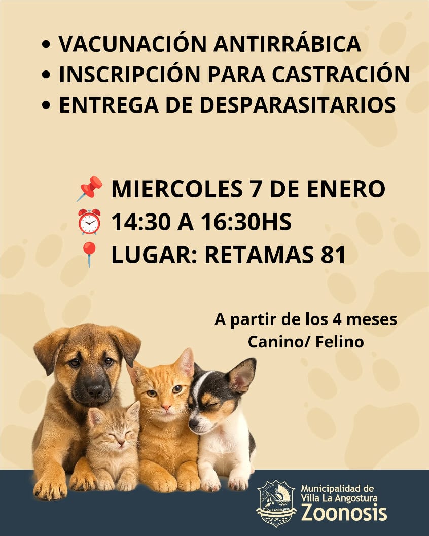 La Municipalidad de Villa La Angostura, a través de la Dirección de Zoonosis, informa que el miércoles 7 de enero, de 14:30 a 16:30 horas, se realizará una jornada de vacunación antirrábica, inscripción para castración y entrega de desparasitarios.