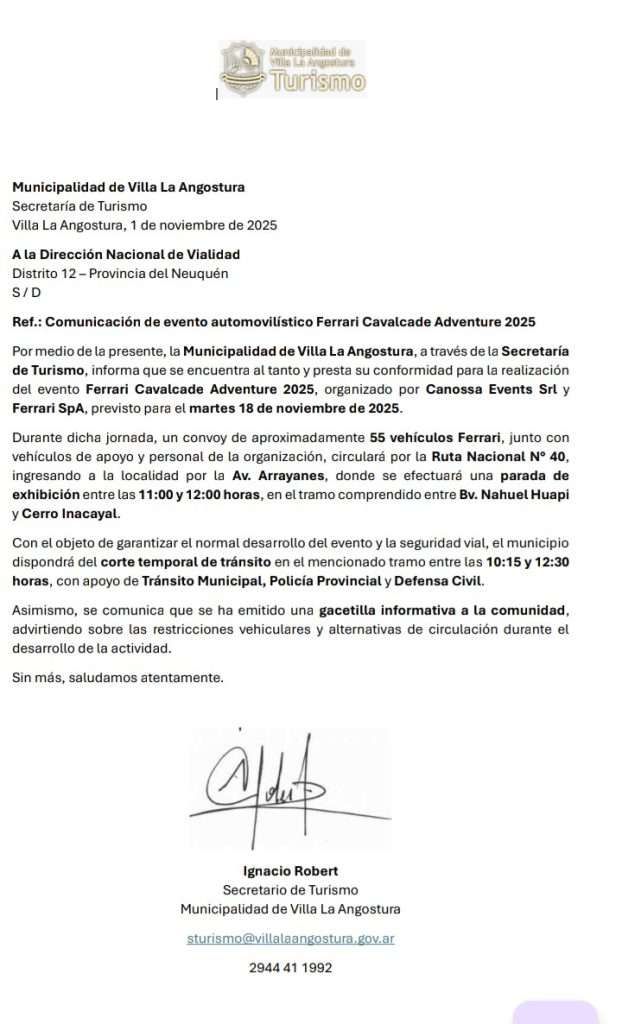 La Municipalidad de Villa La Angostura, a través de la Secretaría de Turismo, informa que se encuentra al tanto y presta su conformidad para la realización del evento Ferrari Cavalcade Adventure 2025, organizado por Canossa Events Srl y Ferrari SpA, previsto para el martes 18 de noviembre de 2025.