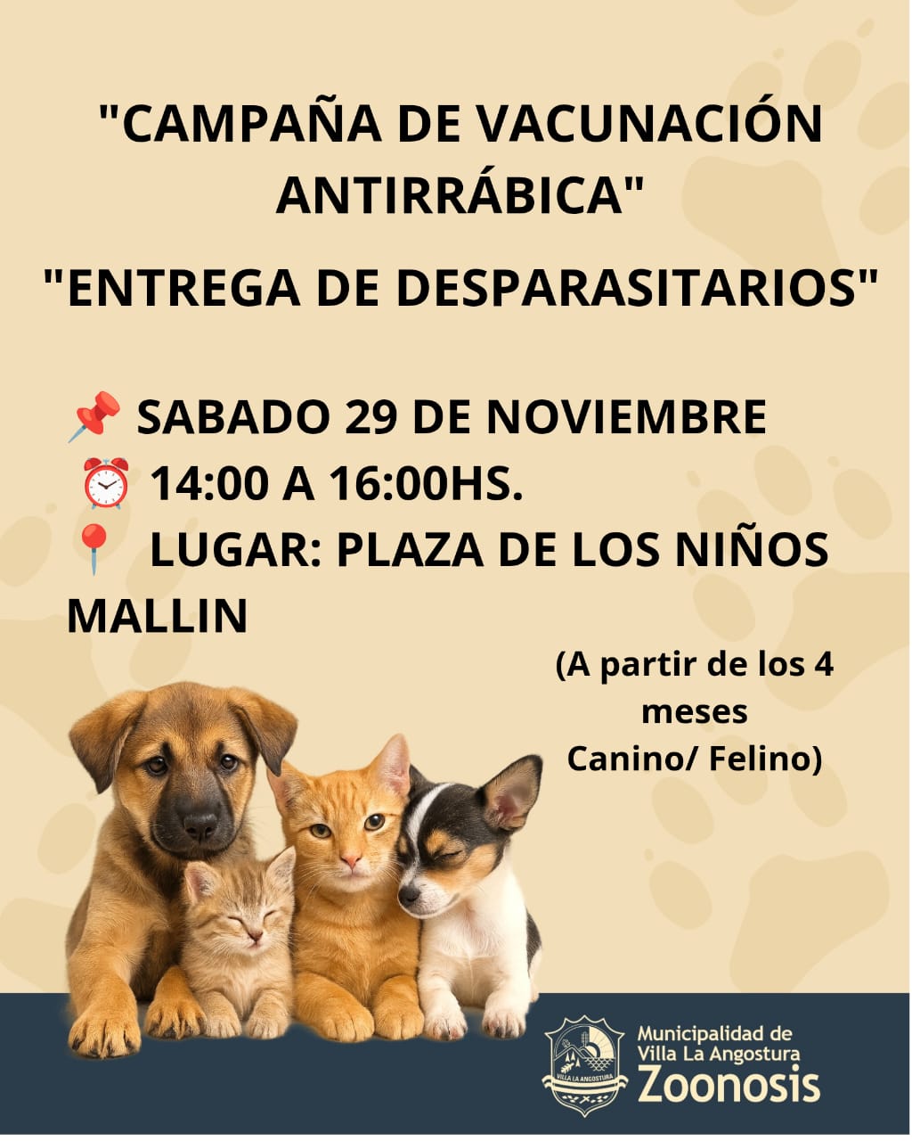 📌 SABADO 29 DE NOVIEMBRE, acercate a la plaza de los niños Barrio MALLIN de 14:00 a 16:00 hs con tu mascota.🐾