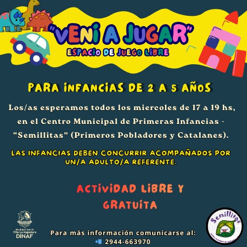 Durante los próximos miércoles, nos encontramos en el Centro Municipal de Primeras Infancias Semillitas! (Primeros Pobladores y Catalanes) Invitamos a todas las familias a disfrutar de un espacio pensado para el juego libre y la imaginación.