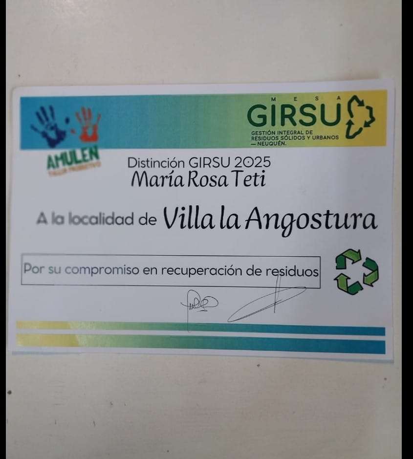 En el marco de la jornada, Villa La Angostura recibió un reconocimiento por la tarea sostenida de recuperación de residuos reciclables, destacándose el trabajo que se viene desarrollando en la separación en origen, la recolección diferenciada y el fortalecimiento de las acciones de concientización ambiental en la comunidad.