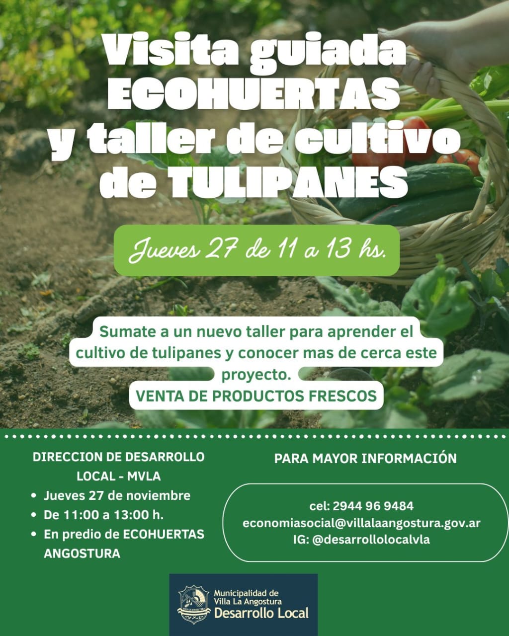La Dirección de Desarrollo Local de la Municipalidad de Villa La Angostura invita a la comunidad a participar de la visita guiada por las Ecohuertas Angostura y del taller de cultivo de tulipanes, que se realizará el jueves 27 de noviembre, de 11 a 13 horas, en el predio del proyecto.